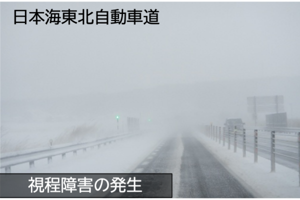 日本海東北自動車道では、強風時に地表の雪が舞い上がり、視界不良による事故の危険性が高まります。これに対し、道路管理者が迅速に状況を把握し、適切な対応を行えるよう、映像を用いて視程障害の発生を自動検知する仕組みの検討を進めています。